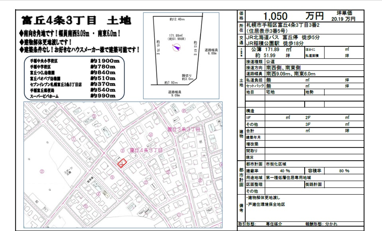 価格改定! 富丘4条3丁目土地 南側角地です! 新着情報 ◆手稲区富丘4条3丁目 ◆171.89㎡(約51.99坪) ◆1050万円 ◆南西・南東角地! ◆建物解体更地渡し! ◆建築条件なし!お好きなハウスメーカー様で建築可能です!