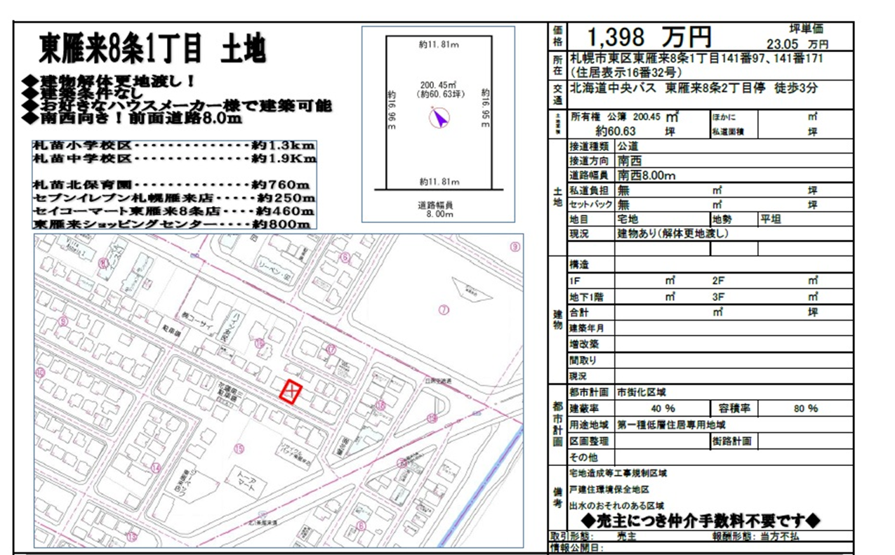 新規売土地販売開始!東雁来8条1丁目 約60.63坪!