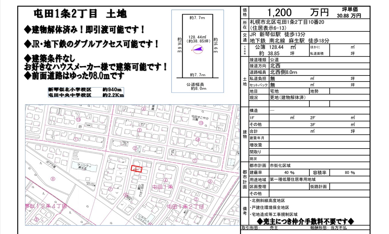 新規売土地 屯田1条2丁目 JR新琴似駅徒歩13分!