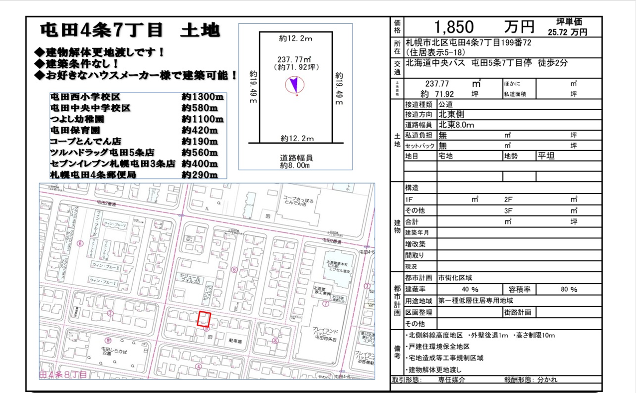 新規売土地販売開始! 屯田4条7丁目 約71.92坪!