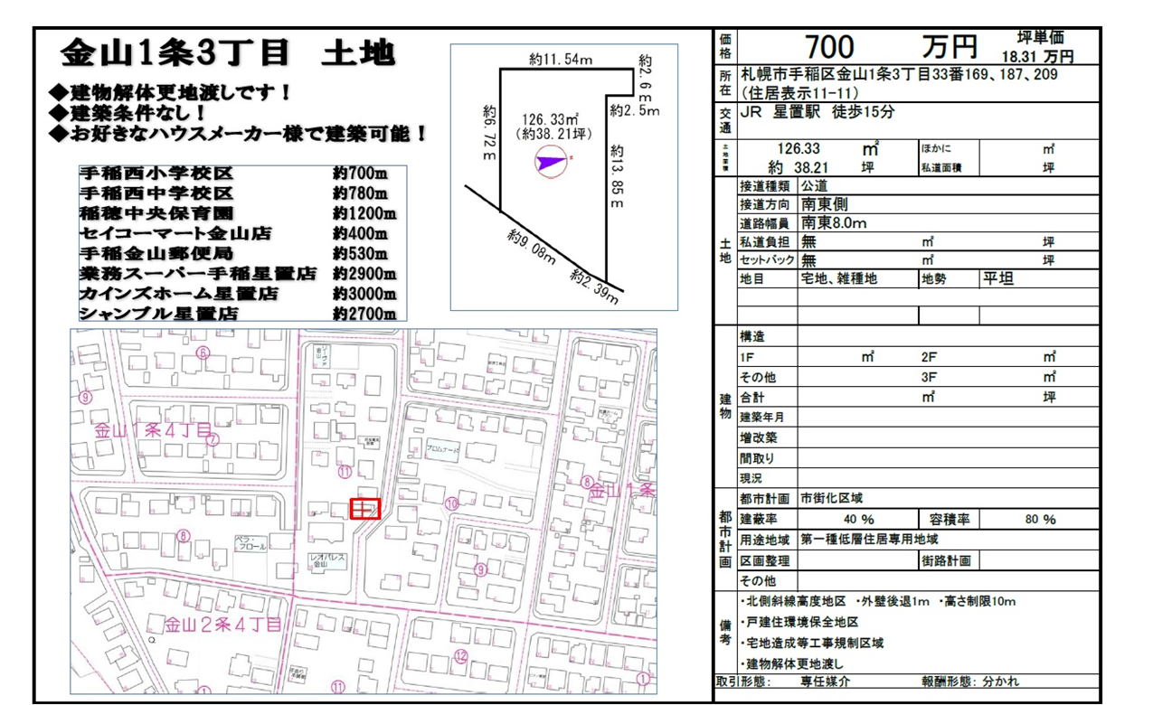 ◆新規売土地販売開始◆手稲区金山1条3丁目