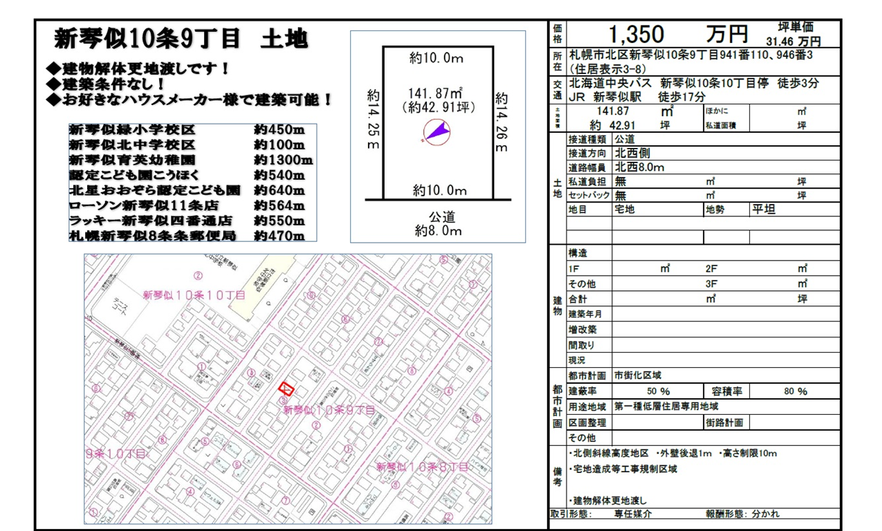 ◆新規売土地販売開始!◆新琴似10条9丁目◆ 新着情報 札幌市北区新琴似10条9丁目 ◆販売価格1350万円 ◆141.87㎡(約42.91坪) 建物解体更地渡し!建築条件なし! お好きなハウスメーカー様で建築可能です