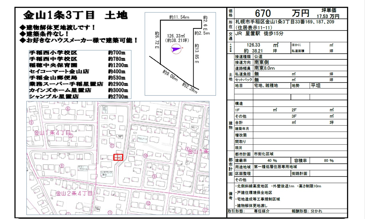 価格改定!◆売土地◆手稲区金山1条3丁目