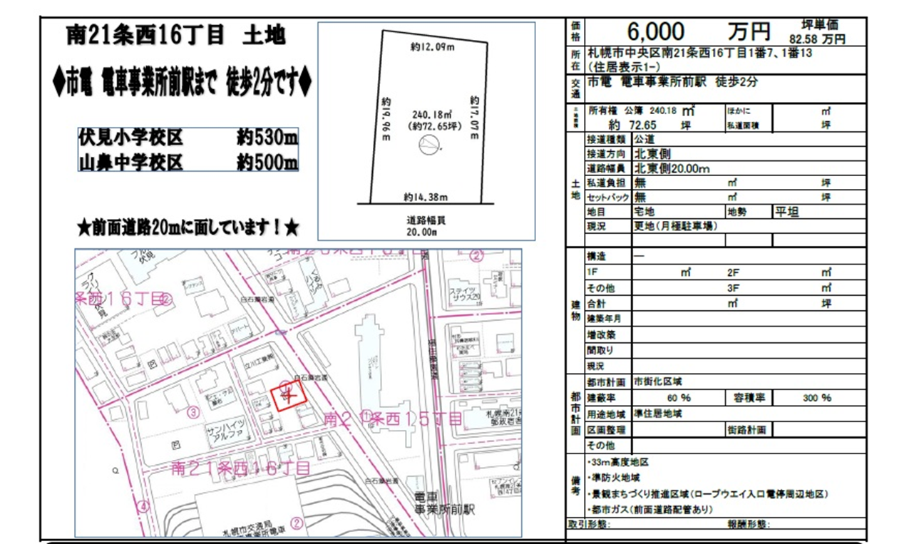 中央区市電 売土地情報 南21条西16丁目(72.65坪)