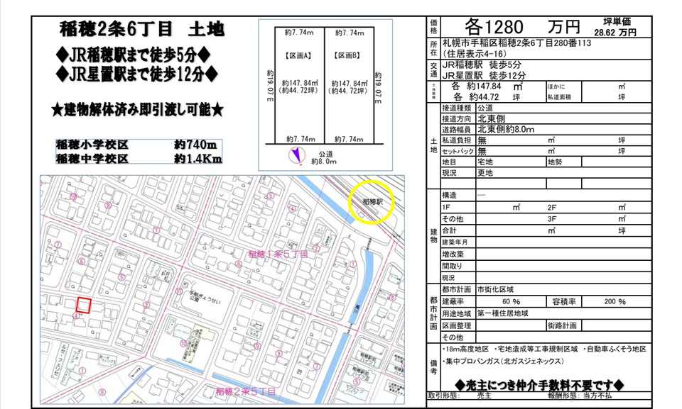◆新規売土地◆稲穂2条6丁目 2区画販売! 1280万円◆